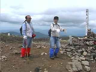 12:10頂上に着く。思っていたより視界が開け、鳥海山が間近に迫っている。ただ、北の方が見通しが悪く岩手山はすそ野の斜面がやっと見えていた。風の当たらない場所で、ビールで乾杯して昼食をとりながら360度の景観を満喫する。