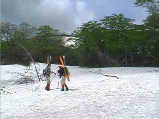 銀明水から上部は、新緑もまだで豊富な残雪に覆われ、きつい斜面を黙々と登る。ピッケルが必要だったが、ビデオカメラがじゃまするため置いてきた。とりあえず、人の踏み後を頼りに慎重に進む。