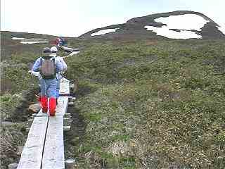 中沼を過ぎると、残雪が登山道を被い所々にあるリボンをたよりに進む。また、一部の道は雪解け水であふれ、沢と化していた。歩きずらいながら、「長靴で良かったな」と互いに慰め合う。