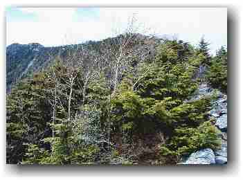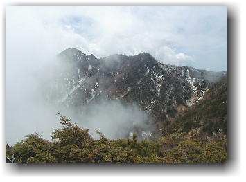 時計を見ると時間があるので、更に女峰山方面に進む。赤薙を少し下りヤセ尾根の岩場を慎重に進む。30分ほどで最初のピークに出るが、赤薙奥社跡はまだ先でシラビソに変わった林の中を再び登る。左側は切り立った急斜面なので、登山道を外れないよう注意しよう。足元が岩と木の根でかなり歩きづらいが、木の間から六方沢橋などが見え苦痛を和らげる。奥社跡は相変わらず視界が悪いが、木々の合間から女峰山方面のガスが切れ優美な姿を現した。
