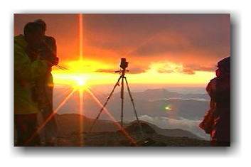 に登山者が広がり、ご来光を待っている。4:40頃雲間から後光が差した。完璧とは言え無いがきれいな朝日だった。おまけのブロッケンも出て感激にむせぶ。