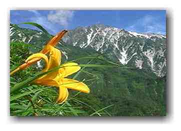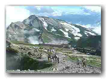 乗鞍岳山頂は広々とした高原で、ガスのあいまから小蓮華岳や朝日岳か゛見えだし展望も良くなる。再びコツゴツした岩場を進むと、白馬大池が眼下に迫り、写真とは別の風景に感激する。大池