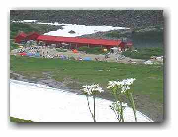 こじんまりした小屋だが、自噴する温泉としては日本一の高さで、標高2100mにある、あまりにも有名な温泉である。さっそく荷物を放り投げ、温泉に浸かる。たまらなくいいゆだった。上から丸見えの浴槽だが、眼下の眺めも最高でスッパダカも気にならない。むしろ、間違って覗いた人が恥ずかしがっていた。