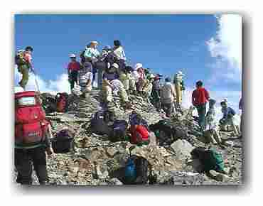 山頂に着くと、5−60人ほどが雄大な景色を堪能していて、ガスも切れ剣岳や立山が間近に望める。素晴らしい、こんな光景は久しぶりだ。森氏と記念撮影をしてもらい、感激にむせぶ。しばしこの光景を満喫して白馬山荘に下る。8:10に出発して小屋に着いたのは、4:10だった。