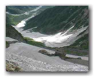 白馬山荘と同様にテキパキとした案内で朝食を取り、名残惜しく猿倉に向け出発する。温泉下部からは、まだ夏道が出ておらず仮設のの案内ロープや橋を渡り、不安定な足場を慎重に下る。鑓沢を渡る付近の雪渓には、多くの落石があり上部に注意しながらトラバースする。合掌岩を抜ける