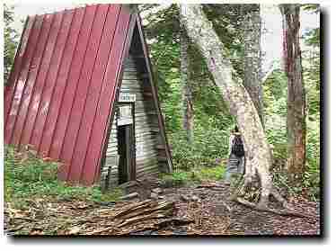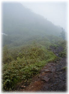 6時20分、武尊避難小屋に着く。屋根が直接地面についたとんがり屋根の小屋は、湿気が多く5−6人程度しか泊まれそうにない。勿論、水場やトイレはなく文字通り避難小屋であった。10分ほど休憩を取り、ぬかるんだ道を上へと進む。マイズルソウがいたるところに群落を作り咲き出している中、まだきつくならない道を進とやがてシラビソ林が目立ちはじめる。程なくセビオス岳付近の湿原に出て、樹林帯が終わる。ここから少々登りもきつくなり、ガスの向こうにクサリ場のある尾根が見えてきた。視界は開けているはずだが、霧雨で50m程しか見えない。