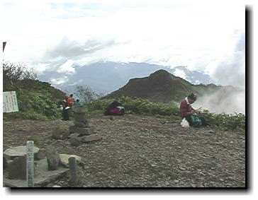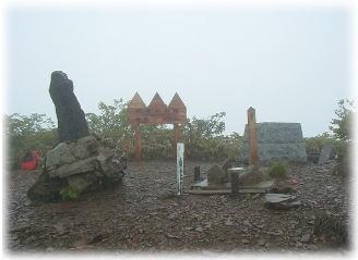 小休止後、下り気味に進むと水場が現れるが雨がまじりあまり美味しい水ではない。枯れたササの枝が登山道を横切り、かなり歩きづらい中に窪地が現れ、雪渓の詰まった池が現れる。池で足下を洗いややきつくなった道を山頂へと急ぐ。大きな岩が現れ、人がいると思ったら像がが立っている。まもなく山頂が見え、板状の石が散らばる岩場を巻くと山頂に出た。8時30分だった。絶景である。360度何も遮る物はない。と言いたいところだったが、何も見えない。雨は上がったが、視界30m位だった。仕方なしに、山頂のレリーフ板の絵を眺めつくす。