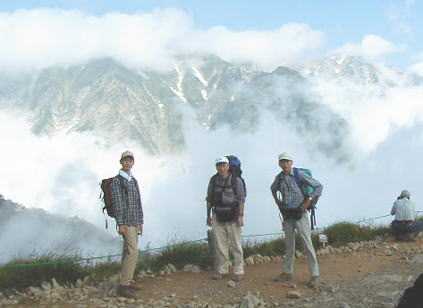 8月3日 白馬山頂でご来光を楽しみ唐松岳に向かい出発する。天候も良く、花々を鑑賞しながら大絶景に包まれた、心地よい縦走路だ。付近にはクルマユリ、イワギキョウ、コマクサ等々素晴らしいお花畑も広がる。白馬鑓ケ岳からの展望も更に良く、剣岳や槍ヶ岳・穂高等もはっきり脳裏に焼き付ける。白馬鑓ケ岳を下ったコルは鑓温泉の分岐で、ここから登山者が急激に少なくなる。天狗山荘手前を少し下るとウルップソウがちょうど見頃となっている。天狗山荘で水を補充して更に先を急ぐが、ガスが濃くなり見通しも悪くなってきた。10歳と言う子供さんと親父さんに先を譲り、天狗の大下りに向かう。ガスの切れ間から不帰嶮のT峰・U峰と顔を出すが、険しい岩峰に行く先が案じられた。天狗の大下りは標高差約300mもあり、角度も約45度とかなりの難所だ。浮き石やザレ場に注意しながら、一歩一歩慎重に下る。向かいの岩峰には先ほどの親子が、へばりついているのが見える。我らは、あの岩峰を登れるものかと心配になる。コルで昼食を取り、今回のメインイベントである不帰嶮に挑む。唐松岳との標高差