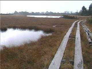 道は鬼怒川の渓谷沿いにつけられ、やや広く歩きやすい。八丁ノ湯まで進むと紅葉も5割かた進み良い雰囲気を出していた。ここから徒歩約10分ごとに加仁湯、日光沢温泉が現れ深山の様相をかもし出している。日光沢温泉の建物の間をくぐると、すぐに根名草山コースと鬼怒沼コースの分岐があり右手に進む。ほどなく歩行専用の橋を渡ると本格的な登り道となる。対岸の山肌は、やっと紅葉が始まり木々の間からチラチラ見えるが、登りがきつくなりゆっくり鑑賞は出来ない。 30分ほど進むと視界が開けオロオソロシノ滝見晴らしに着き、この滝を眺めて小休止する。ここから約30分ほど登るとトウヒの大木の林に入り傾斜も緩くなる。紅葉もこの付近がちょうど良いようだが、霜にでもやられたのか葉がちじれ色づきは悪い。しばらくジメジメた道が続き、足下をかばいながら進むと視界が開け鬼怒沼の入口に着く。鬼怒沼は尾瀬の大江湿原を半分にしたくらいの広さで、大きいものは約20アールぐらいの沼や小さい池塘が点々と広がり、なかなか見応えのある湿原だ。また南方には白根山や根名草山が間近に望め、湿原の北側に行くと燧ヶ岳の優美な姿が望める。花こそ咲いていないが、草紅葉と周りの山々とのマッチした景観は、尾瀬ヶ原にも似ている。標高2039mと書いてあり、高山にある湿原としては日本一のたかさを誇る。 |