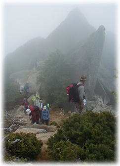 比較的乾ききったガスの中を、やせ尾根の続く岩場に向け慎重に下る。ガスの中にドデカイ岩が現れ、六方石に着く。ここから直登コースと魔利支天側を通るコースの二つに別れるが、直登コースを行く。このコースは大きな岩場がつづき、フリークライミング気分を味わえられる楽しいコースで、少し強い風を受けながら快適に進む。視界がよければ高度感も抜群だったかもしれない。しばらく登ると岩場もまばらになり、ザレ場となって歩きづらくなる。ふと気がつくと後続部隊が見えなくなり、しばらく待つが少し体が冷えてきたので山頂に進む。