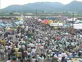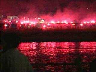 1998.8.22−23 山岳会より4名参加 22日、一関から2台の車に13名が分乗して出発する。湯田と横手で渋滞に巻き込まれ約1時間遅れで大曲に到着する。 地元の友人宅で昼食と休憩をとり、4:00頃人混みの中を会場に向かう。 露天商人混みなど、ものすごい。こんなの初めてだ。雄物川の河川敷は、堤防も含め人でいっぱいだ。桟敷席は、まだ余裕もみられたが、満杯になると何と5万人も入るそうだ。後で本部から聞いたのだが今年は60万人の観客た゛ったらしい。たった2−3時間のイベントにこれだけの人々が全国から集まるのだからすばらしい。 我らパーテイも、特等席に腰を下ろし、花火が始まる前に早速宴会を始める。今年は風向きも良さそうで、天気もまあまあだ。6:00昼花火の開始であるが、「まだまだこれからだ、飲め」の声に宴がはずむ。 7:00軽やかに秋田放送のアナウンサーの案内で、長さ500mの大ナイアガラの滝が始まった。すごい、ものすごいスケールである。つづく競演会も各花火会社の力作揃いだ。一関だとスターマインは1分位で終わるのが、大曲では5分位も続き、ビデオカメラを構えるのには苦労した。さらに、一尺玉は大きすぎてカメラにおさまらない。音も桟敷席に振動を与え、上下からものすごい迫力であった。あの一瞬、一瞬の光の輝きに観客も「オー」とどよめく。迫力満点である。これを見ると、もー病みつきにになりそうだ。 さらに、大会提供の花火は、またものすごい。巾150から200m位に一列に並んで5−6カ所から一斉に花火が上がった。どこを見ればよいかわからない。天井が花火だらけだ。ずざまじいー。まいった。 フィナーレには、100名あまりの花火師さんが真っな花火を手にして、一斉に振ってくれた。観客も、懐中電灯などで答える。いやー、えがったですよ、もう癖になりそうです。 秋田名物に、はたはた、おがぶりこしゅんけい、なっとう、まげわっぱ、なんてたって大曲の大花火大会、個人的にはきりたんぽ、比内地鶏、いぶりがっこを加えたい。 尚、ゴミ問題でかなり関係者が頭を痛めている様子ですが、けっこう分別収集に協力していた様でした。 大会関係者のみなさん たいへん御苦労さまでした 来年もよろしくおねがいします。 |
