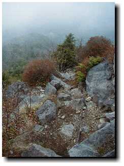 天気は高曇りだが東側からガスがわきだしている。夕方には雨の予想で早速、追われるように男体山とは逆方向に登山開始する。唐松の黄色があざやかな中、緩い傾斜をのんびり進むとやがてコメツガ林に変わり、何気なく見上げると八海山神像が現れてビックリする。ここから急斜面に変わり、岩や木の根が不規則な落差を作りペースを保てなくなる。うっそうとした林には倒木も多く、道を間違えそうだが要所要所に赤と白に塗り分けられた約15cm角の標識が取り付けてある。