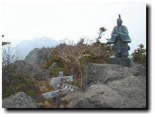 山頂の西側にはまだガスがかからず、戦場ヶ原から太郎山が見えてとりあえず景色を堪能する。ゴツゴツした岩場の山頂には祠が奉られ、ここにも青銅製の像が立っている。一人でいると不気味に感じられ、信仰の山を実感する。早い昼食を取りながら、ガスのわく方向に見えるであろう山々を想像して自己満足。気温が低いため早々に下山開始する。