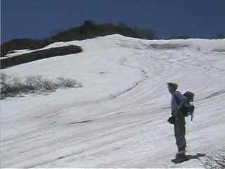 | この雪渓の上部で迷う |
