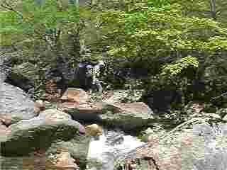 湯沢徒渉点は、左岸が大きく崩れ、沢に岩石がせり出して、対岸の登り口がわかりずらい。対岸に向かい、30mくらい上流部に登り口の印、白いビニール紐が結んであった。この辺には昔、手ぼりの湯が有ったが地形も変わり面影も無くなっていて、温泉の湧きだし口も見つからなかった。