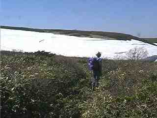 このドゾウ沢源流は、高山植物も豊富にあり初夏の頃には、お花畑になる楽しい場所だ。1:00ここを離れ、二度目の登山道探しが始まった。15分ほど探し、産女川源流に出たのが1:30頃だった。ここにも大雪田が広がり、雪解けが遅いことを実感する。この場所も、初夏にはお花畑となる。