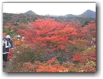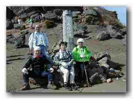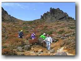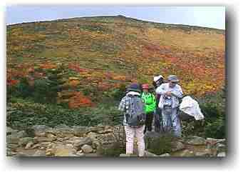 五葉松平で視界が開け、赤や黄色に彩られた山肌が登山者を歓迎してくれた。歓喜の声が流れる中、シャッターを切る人やビデオを回す人で、お互い場所の譲り合いが絶えなかった。我がパーティも記念撮影としゃれこむ。