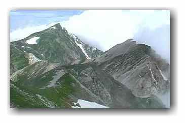 乗鞍岳山頂は広々とした高原で、ガスのあいまから小蓮華岳や朝日岳か゛見えだし展望も良くなる。再びコツゴツした岩場を進むと、白馬大池が眼下に迫り、写真とは別の風景に感激する。大池