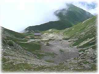 馬の背に入るとお花畑が点在し、クロユリの群落があった。灌木帯には入り、馬の背から別れ更に下ると林の中から馬の背ヒュッテが現れる。なかなか良い小屋だが宿泊者以外は、中に入れない。小休止後、更に少し下ると藪沢に出会う。ここで道は二つに分かれるが、我らは小仙丈尾根の五合目に向かう。しばらく進むと、無人の作業小屋みたいな小屋が現れた。藪沢小屋だった。中から、イメージと違う綺麗なお姉ーさんが出てきてビックリ。「コーヒーでもいかがですか」と言われ、あぁぁっと言葉に詰まる。