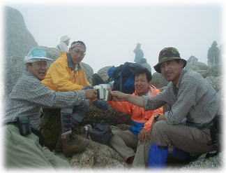 山頂は奇岩が林立し、かなり広く大勢の登山者が集っている。山頂標識の前では、記念撮影待ちの状態だ。ドサクサ混じりに小生もシャッターを押してもらい大満足する。岩陰に陣取ると後続部隊もそろい、バンで昼食を取るが視界は開けずじまいだった。かなりの大展望を期待していたが、早出したにも関わらずガスの巻くのが早かった。午後になると風向きが東から西に変わるはずで、その瞬間を待ちたかったが待ちきれず11:15山頂に別れを告げる。